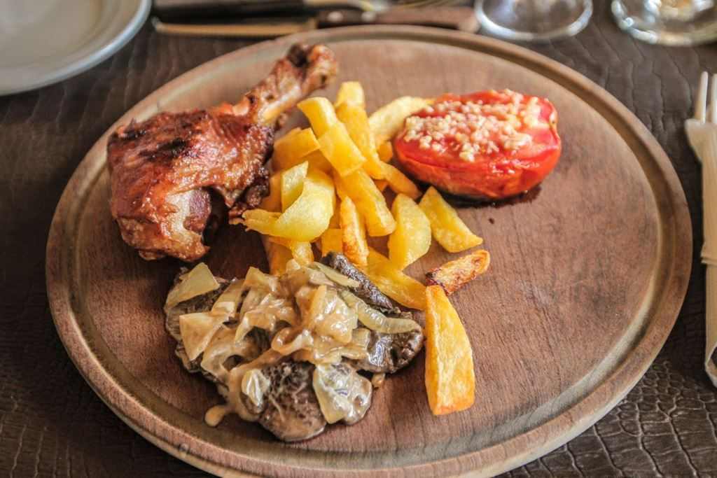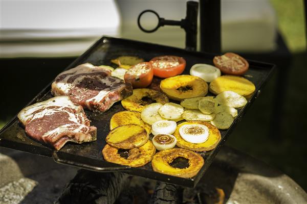 Meat and vegetables cooked on the planchetta